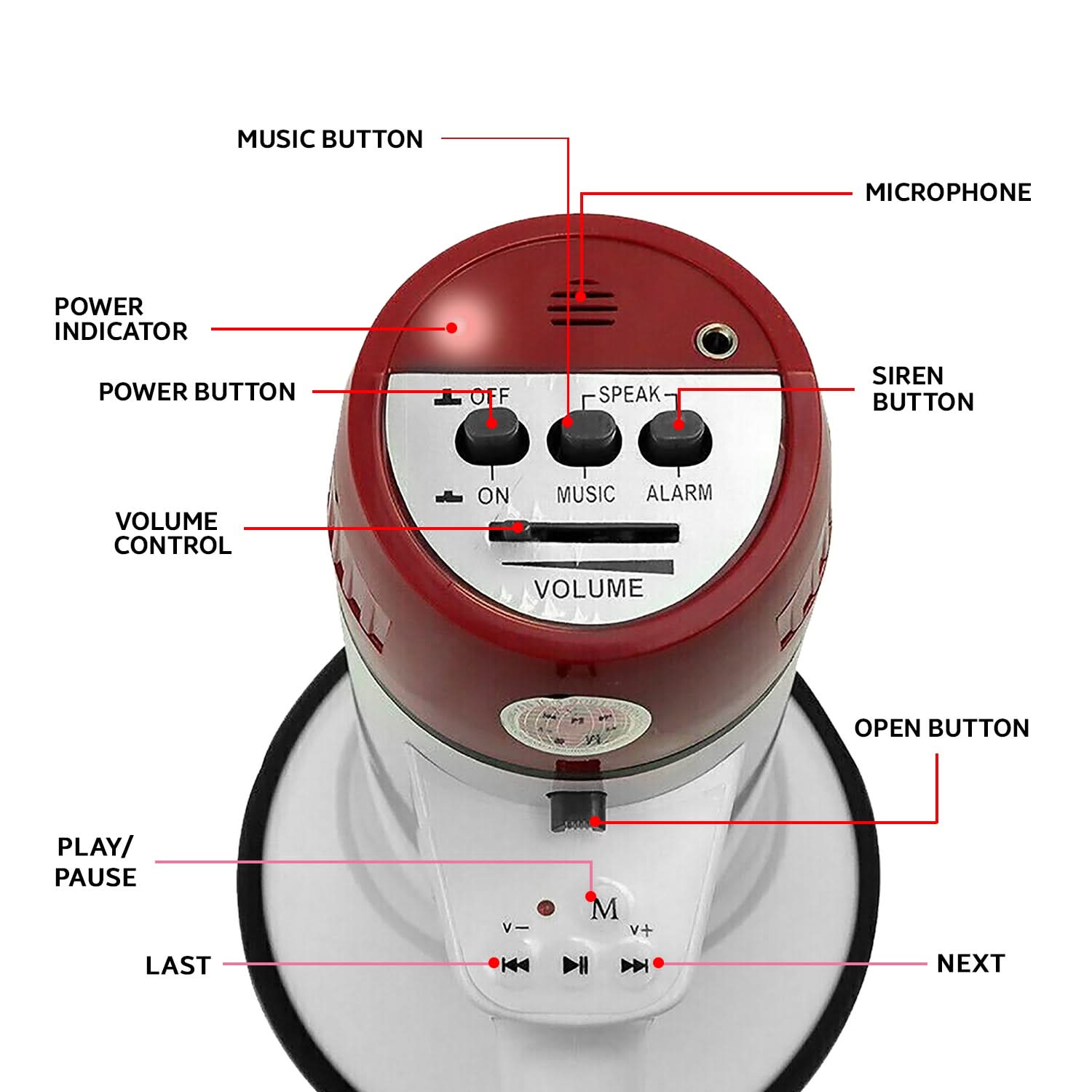 5 Core professional bullhorn megaphone, designed to make your voice heard with clarity and precision! Available in sleek white and red color, it delivers a robust 50W of power, ensuring your message carries across any crowd. Easily adjust the volume on the bull horn loud speaker to suit your needs. The bullhorn features a dedicated alarm mode and recording function; it's perfect for emergencies and for announcing repetitive messages. The detachable mic in the portable blowhorn megaphone offers versatility in sound projection. With an impressive 300 meters voice projection range, powered by 6 type D batteries (not included), this powerful loudhailer is your ultimate communication tool for any event or occasion. |