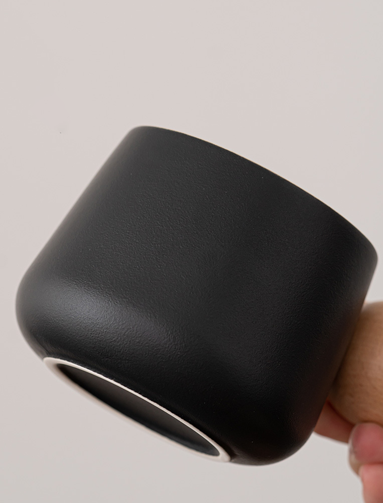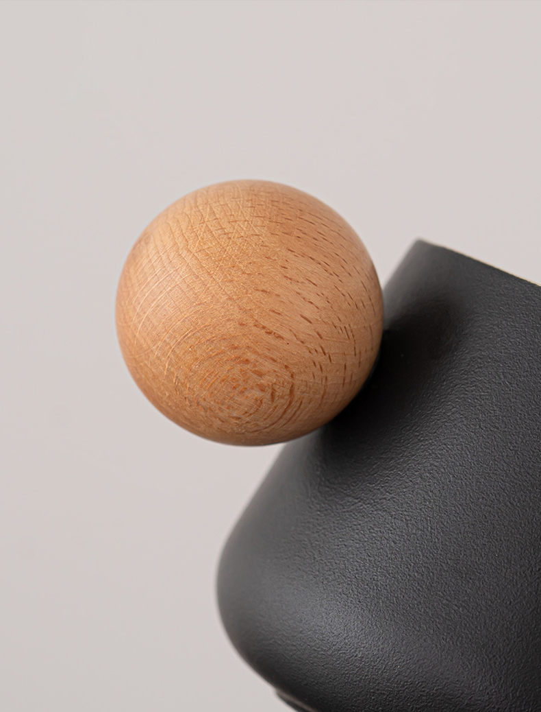 Spherical Wooden Handle: Made from polished beechwood, the rounded handle is not only ergonomic but also adds a warm, natural accent to the ceramic body.