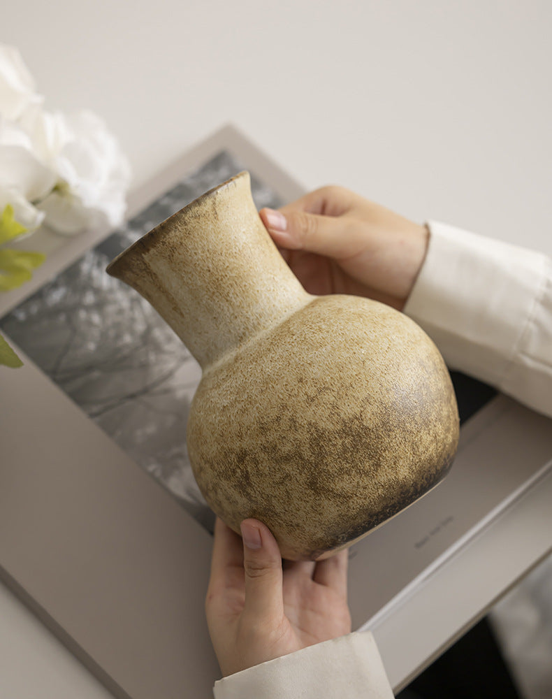The design features a rounded body with a gently flared neck, creating a harmonious silhouette that enhances both fresh and dried floral arrangements. Its rustic glaze, achieved through a traditional kiln-changing technique, gives every vase its own distinct characterβmaking it not just a vessel, but a piece of art.