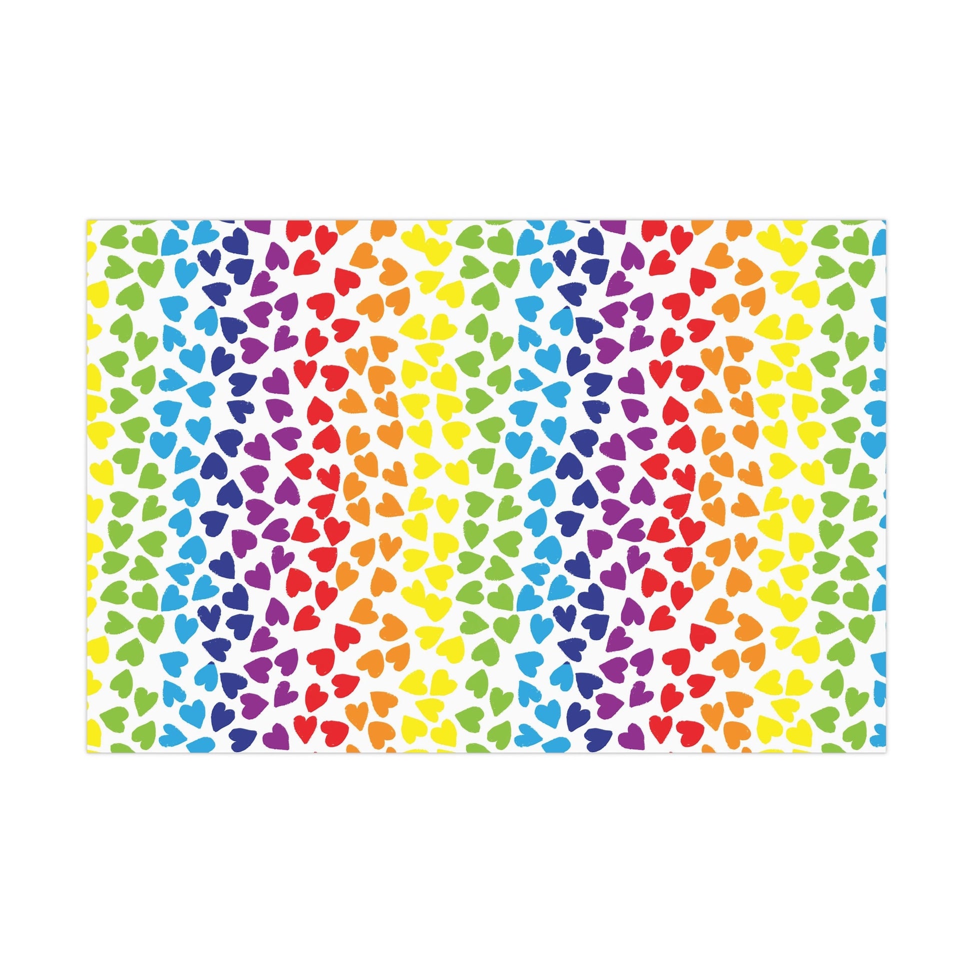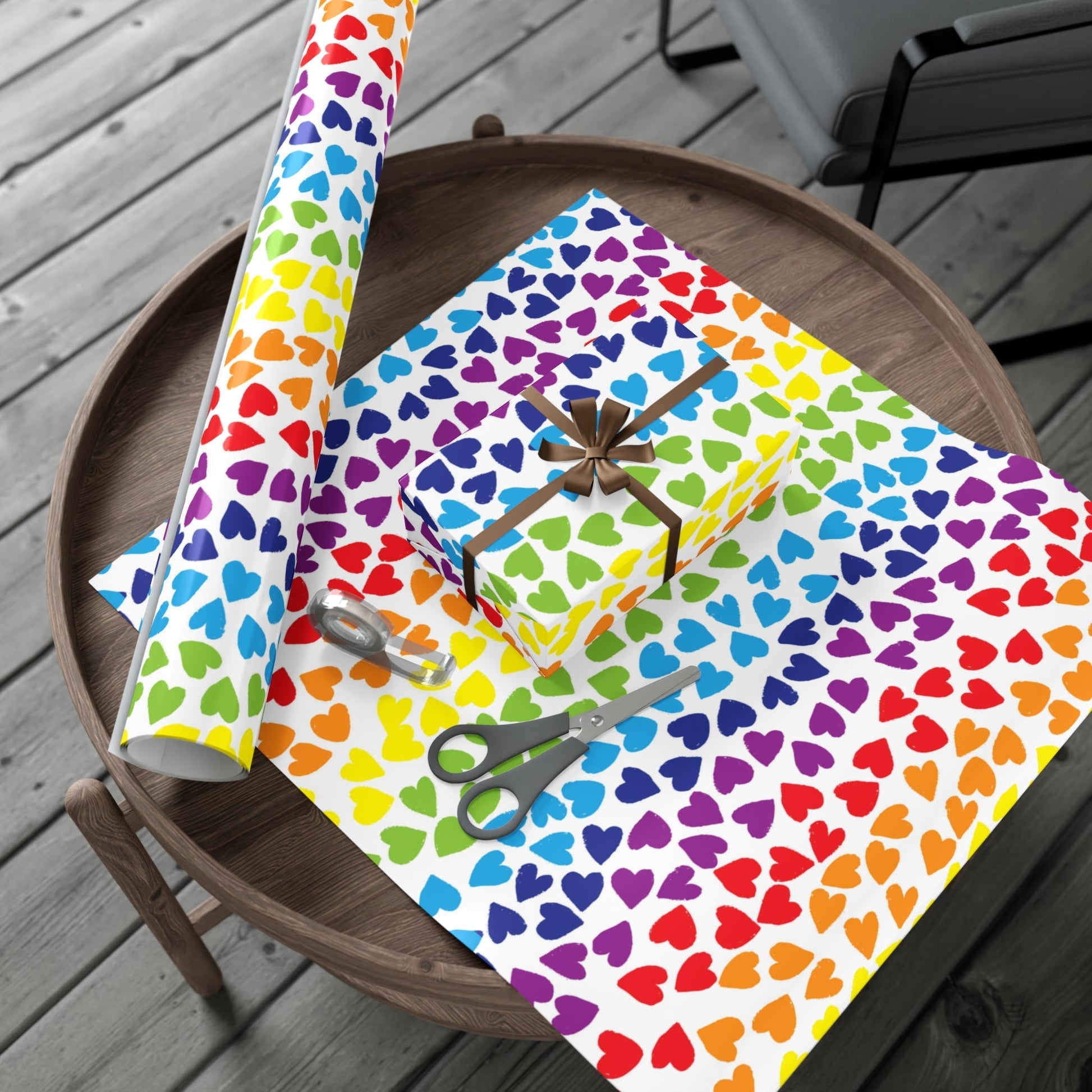 Make any gift bring an even wider smile to the receiver with our awesome pride wrapping paper. Available in two paper finishes (satin, matte). Each sheet is printed using GreenGuard UL Certified inks and the blank paper is made in the USA under strict quality control. Hope you love our pride rainbow and heart gift wrap as much as we do.