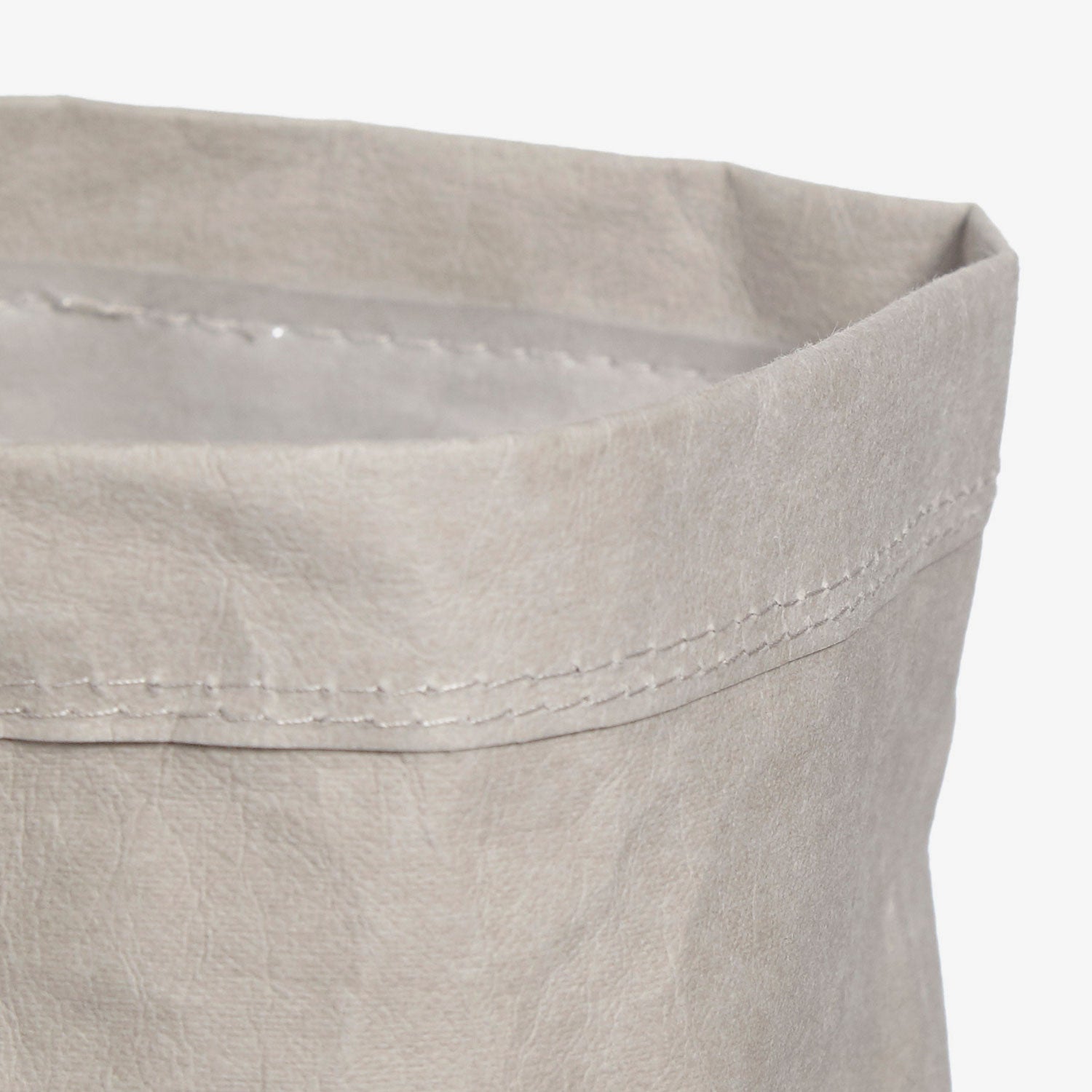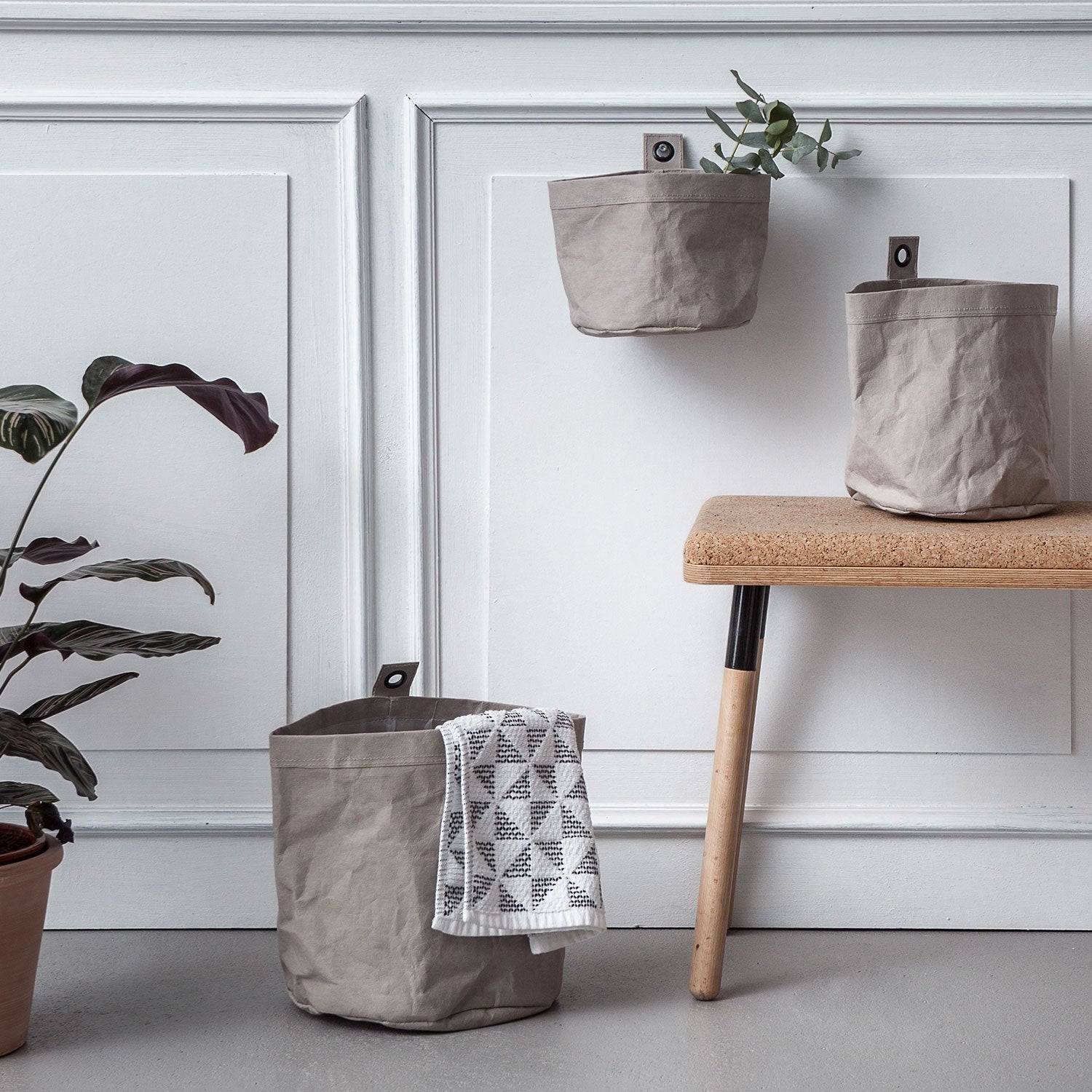 Washable and tear resistant paper storage containers are produced in a durable material which can be used for storage of all types of products. Using the metal eyelet to hang the bag allows for a unique and space saving solution to display hanging plants for instance. The special look and feel of these bags will give your home that extra stylish touch you are looking for. • Ideal for potting plants, small towels and other bathroom accessories and kitchen accessories. • Size: D15xH14cm